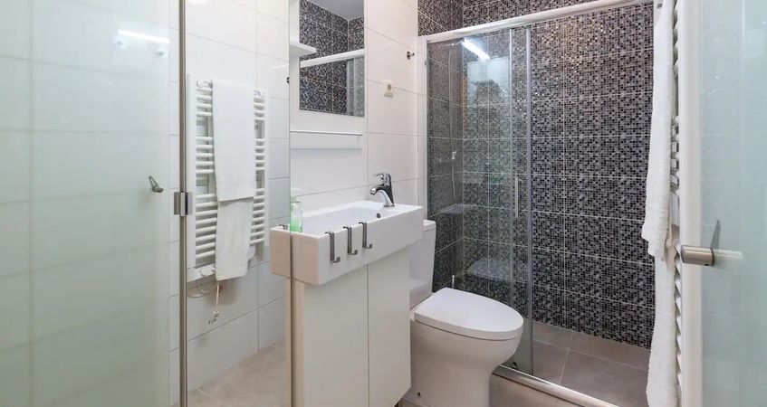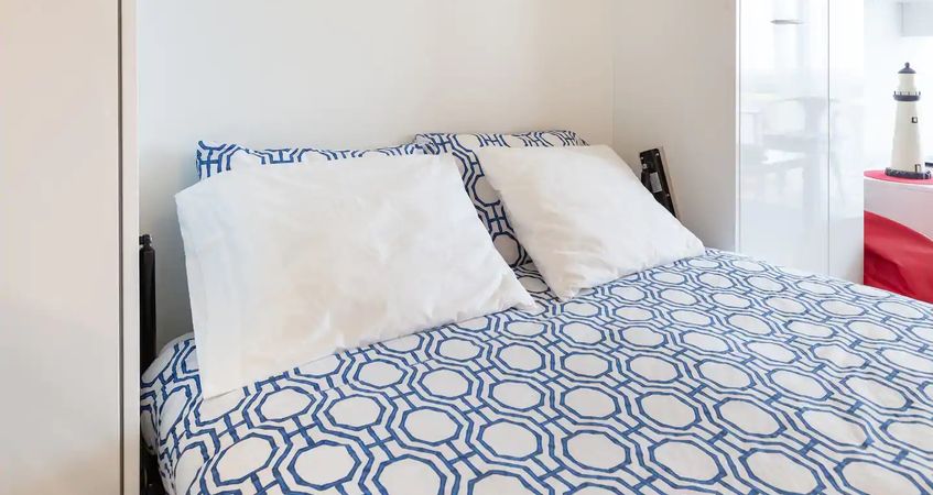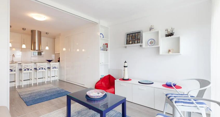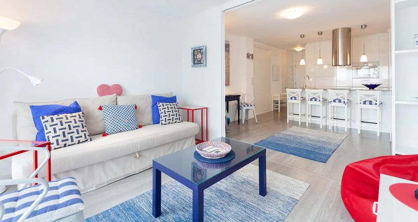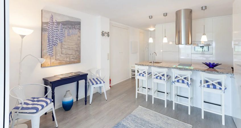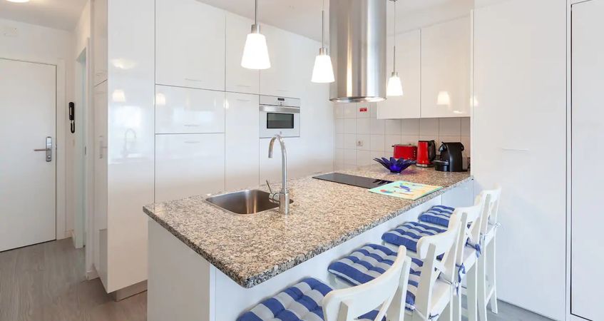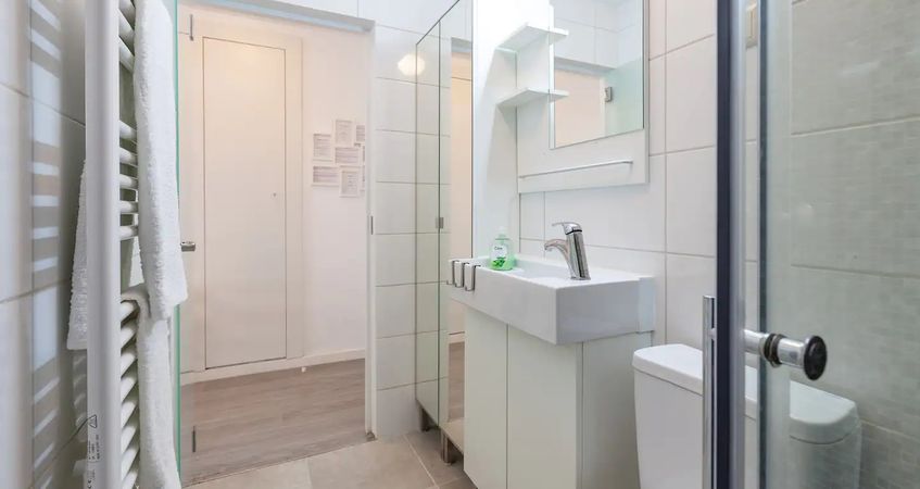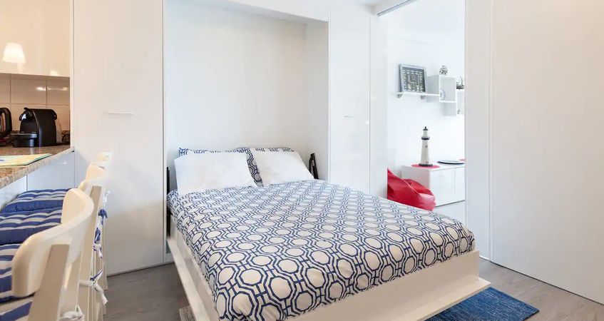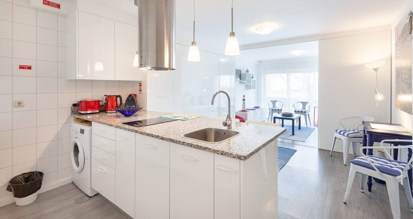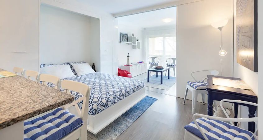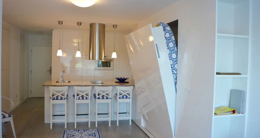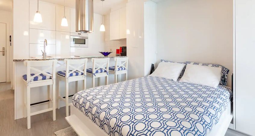 O estúdio situa-se no rés-do-chão de um prédio residencial. Tem uma ampla sala que funciona como sala de estar, jantar e kitchenette durante o dia e se pode transformar, durante a noite, em dois quartos individualizados por uma grande porta de correr. Uma das camas é uma cama rebatível para a parede a outra é um sofá cama. A kitchenette está totalmente equipada com máquinas de lavar a roupa e a louça, frigorífico e forno combinado com microondas. Todo o espaço foi remodelado em Julho de 2017.