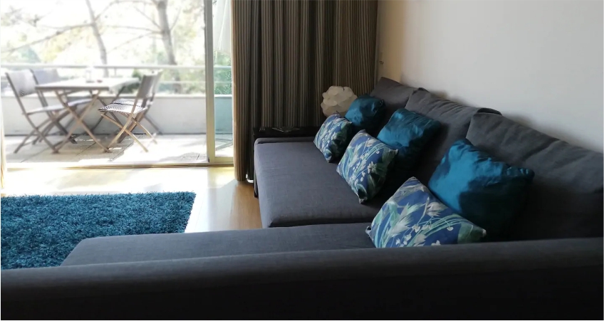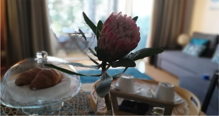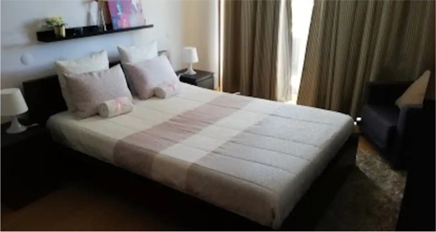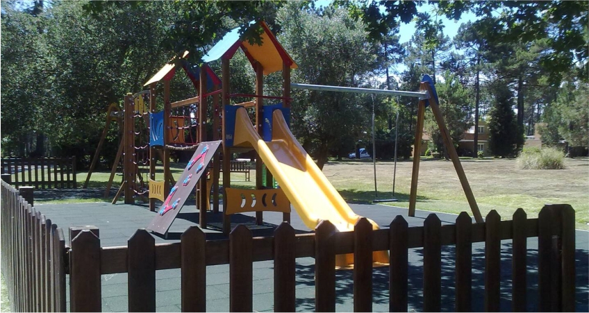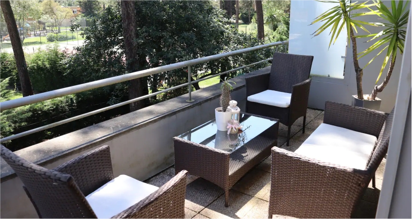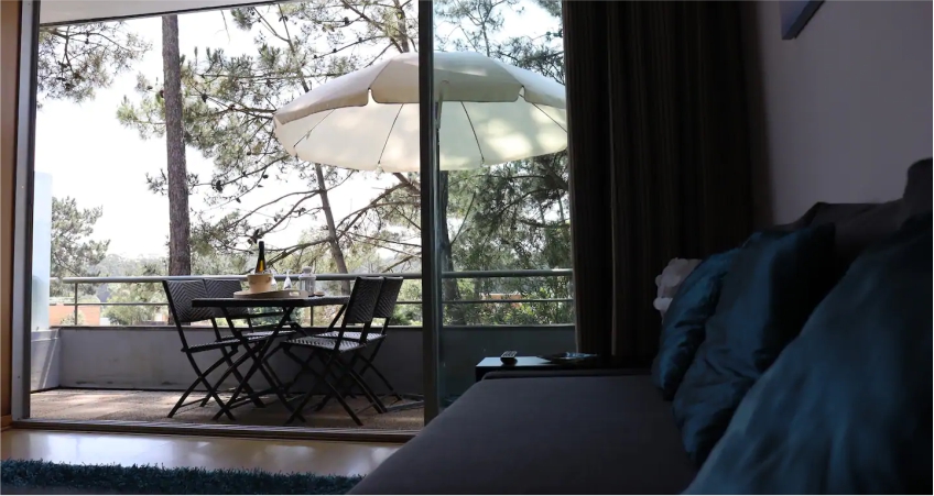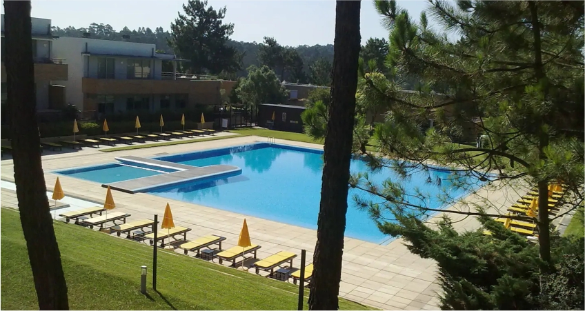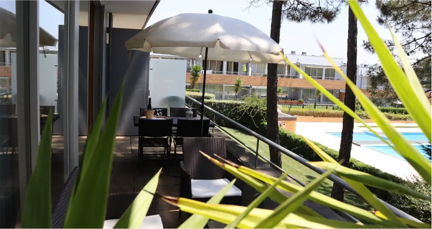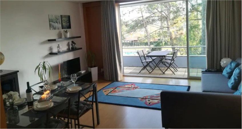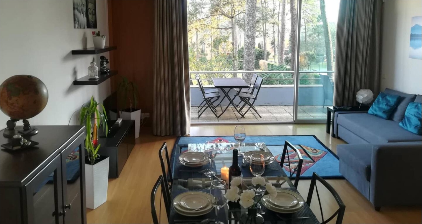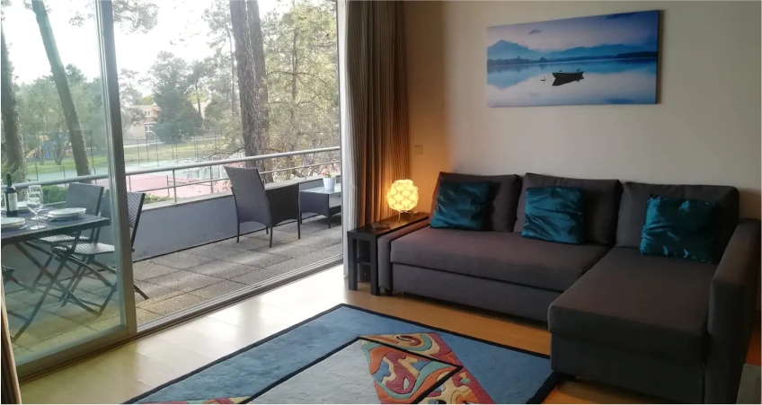 O apartamento tem um quarto espaçoso, casa de banho completa, cozinha kitchenette e sala ampla, varanda espaçosa com mesa e 4 cadeiras, conjunto de sofás e mesa de apoio, com vista para a piscina e jardins. Acesso à Piscina e campos de ténis. O quarto tem cama de casal, berço e um sofá-cama individual; dispõe de TV com canais por cabo e pequeno sistema de som. A sala é comum, com sofá (sofá-cama casal), TV com canais por cabo , WI-FI, mesa de jantar e 4 cadeiras. Tanto o quarto como a sala são voltados para a varanda. Cozinha equipada com máquina de lavar roupa, frigorífico, placa de indução, forno, micro-ondas e pequenos electrodomésticos, (máquina de café, torradeira, varinha mágica). Tem também ferro de engomar e pequena tábua. Disponibiliza-se 2 raquetes e bolas para utilizar nos respectivos courts de ténis.