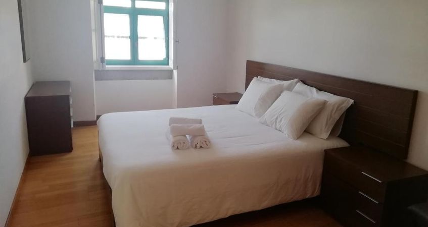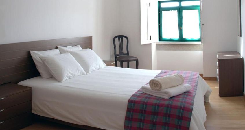 Todos os quartos têm cama de casal, roupeiro com cabides, cómoda e vista para a Praça Francisco Meireles.