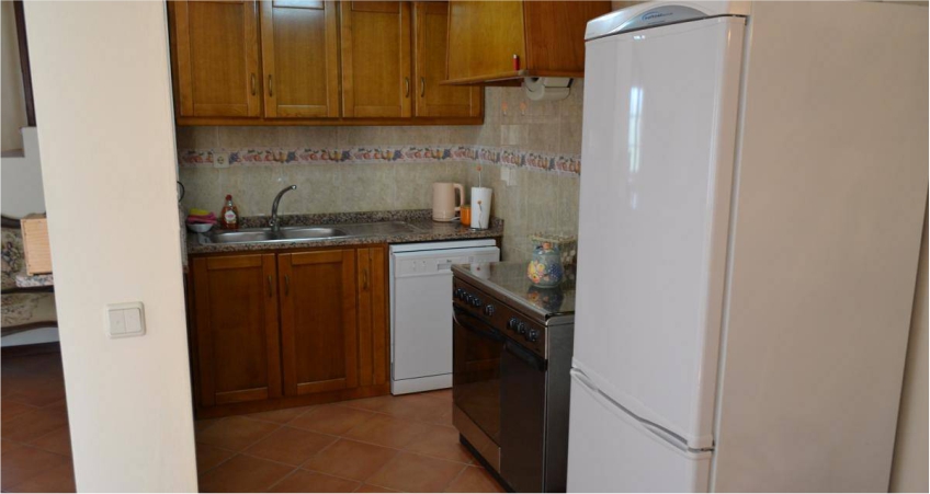 Cozinha equipada com utensílios, camas com lençóis.