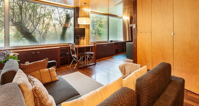 O estúdio oferece acomodação para 2 pessoas, com um espaçoso quarto de estar, cozinha compacta e banheiro separado. As amplas janelas da frente e a varanda oferecem vistas panorâmicas do riacho.