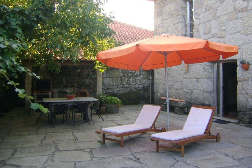 Na parte de fora da casa existe um terraço com muito espaço para as crianças brincarem, tem cerca de 90 metros quadrados. Dá também para fazer uns churrascos pois tem um alpendre com churrasqueira e forno com lenha incluida, junto à churrasqueira tem uma mesa e cadeiras e outro mobiliario exterior, tem também espreguiçadeiras com guarda-sol.