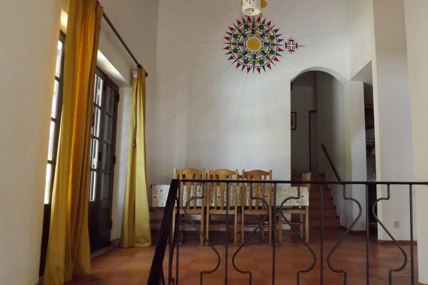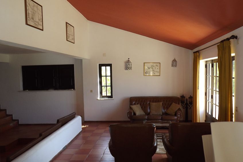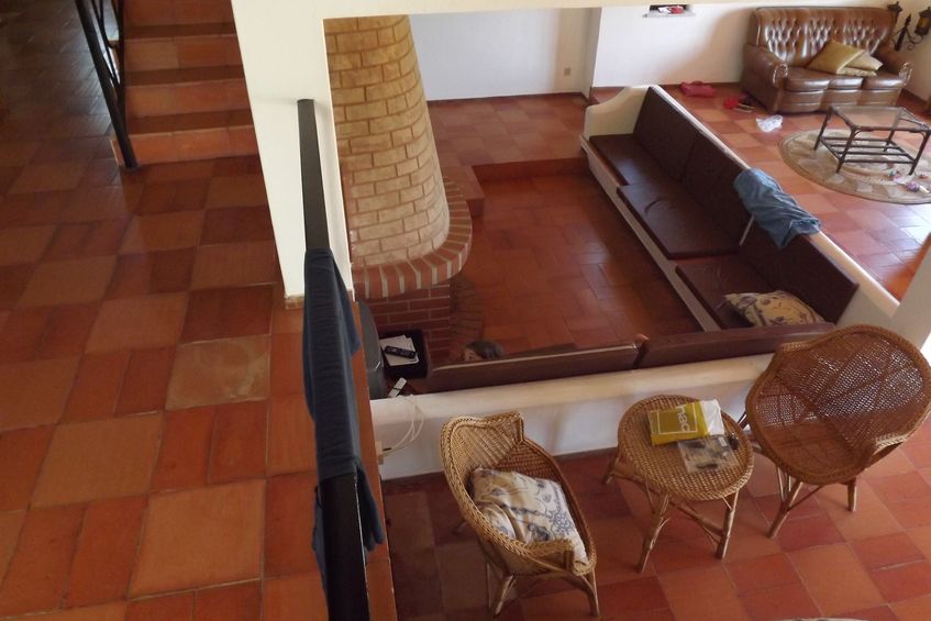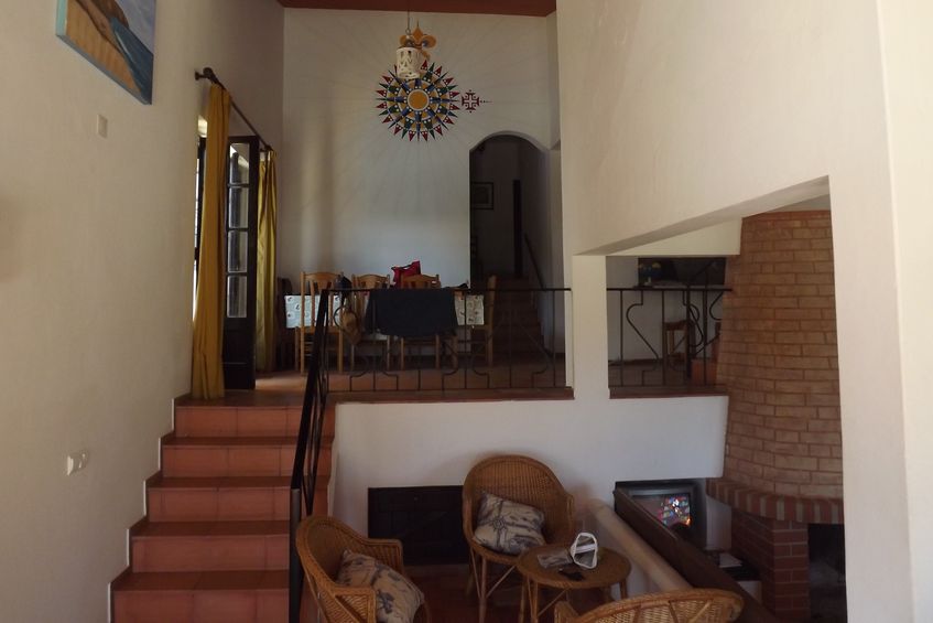 Dentro da casa há a cozinha totalmente equipada, em área aberta que permite contemplar a vasta sala com lareira e com várias áreas de estar e zona de refeições. A sala tem várias portas para os terraços e piscina.