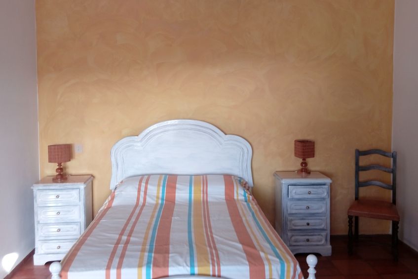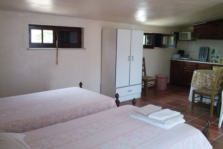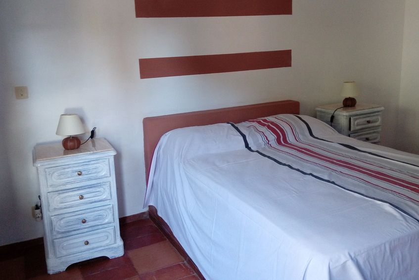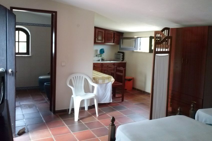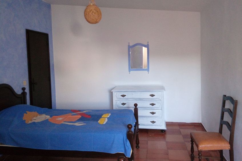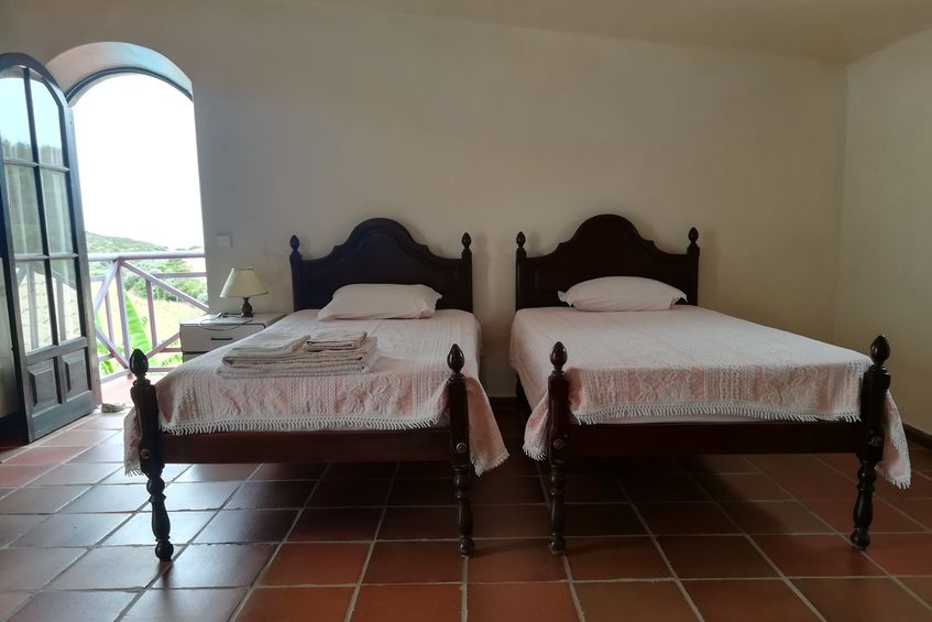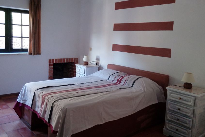 Existem vários lances de escadas que permitem aceder à sala e à zona de quartos. Há um quarto suite com lareira e acesso ao exterior, um quarto de cama de casal com vista para a praia e piscina, um quarto com 2 camas individuais e outro com 2 camas individuais no sótão.