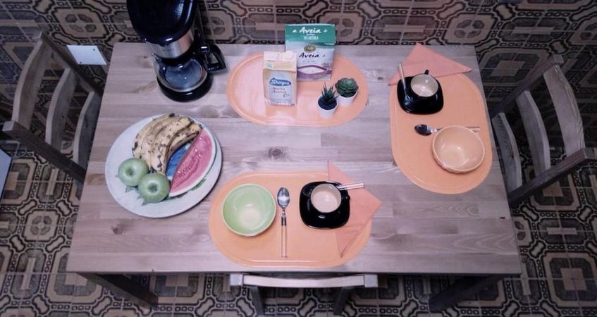 Cozinha: louça. talheres, utensílios, jarro elétrico, frigorífico, micro-ondas, torradeira, varinha-mágica, máquina de lavar louça.