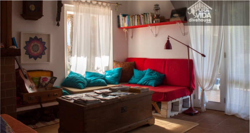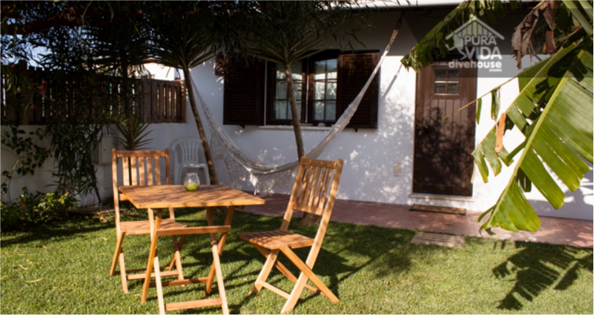 Pura Vida Divehouse has two dorm rooms, kitchen facilities, living room and one bathroom in the main house. You are free to cook, use the fridge and all kitchen utensils and appliances for your meals and to chill, read, play games, watch tv, play piano and guitar and so much more on our living room. Outside the hostel, you can find proper relaxing areas - a veranda with a hammock right next to the garden, bean bags or just sit on the grass we keep for you. The studio is right next to the house and it is self-contained with a kitchenette, bathroom and a room for up to 4 people.