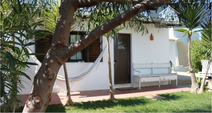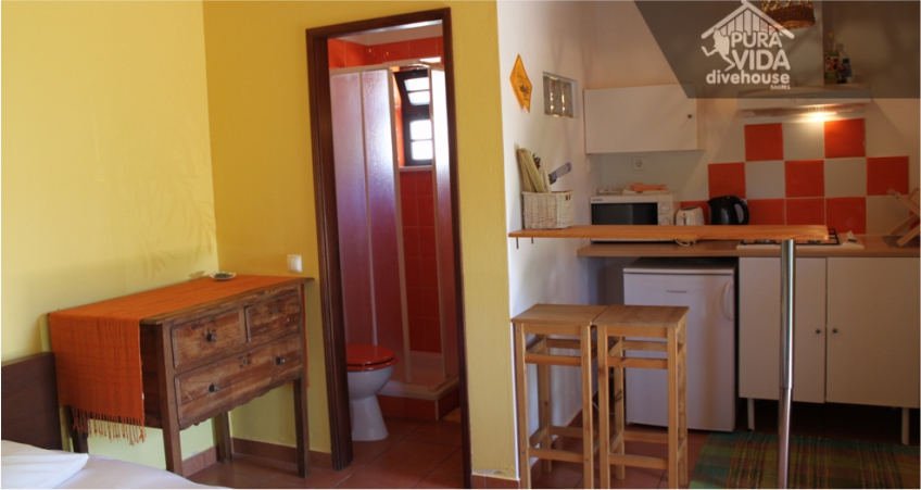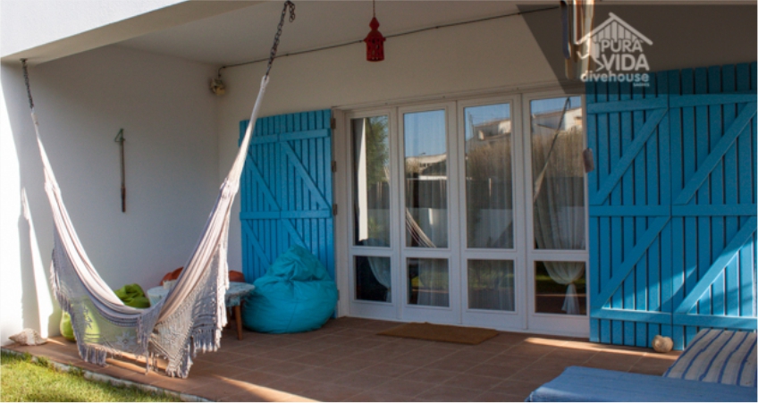 A Pura Vida Divehouse tem dois dormitórios, cozinha, sala-de-estar e uma casa-de-banho no edifício principal. As instalações estão à disposição, podendo os hóspedes usar a cozinha para as suas refeições e descontrair, lear, jogar jogos, ver tv, tocar piano e guitarra e muito mais na nossa sala-de-estar. No jardim, poderão encontrar áreas chillout - uma varanda com uma cama-de-rede, puffs ou simplesmente sentarem-se na relva que mantemos para todos. O estúdio privado está junto à casa principal e é independente, com kitchenette, casa-de-banho e quarto privados, para até 4 pessoas.