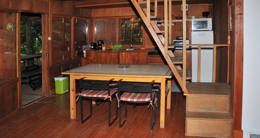 A Cabana dispõe de um deck com mesa de madeira e bancos onde é possível relaxar e desfrutar de refeições. Possui igualmente dum espaço exterior para churrasco.