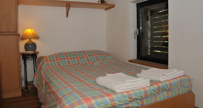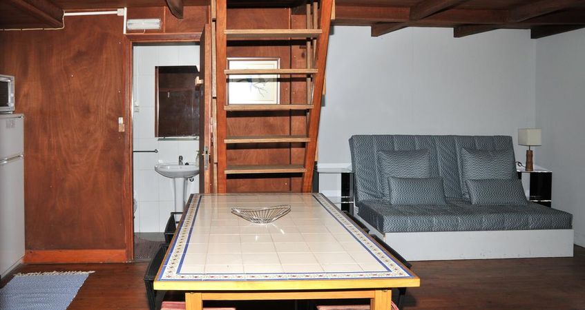No piso inferior, encontra-se um quarto com cama de casal, uma cama individual, um sofa-cama e uma casa de banho.