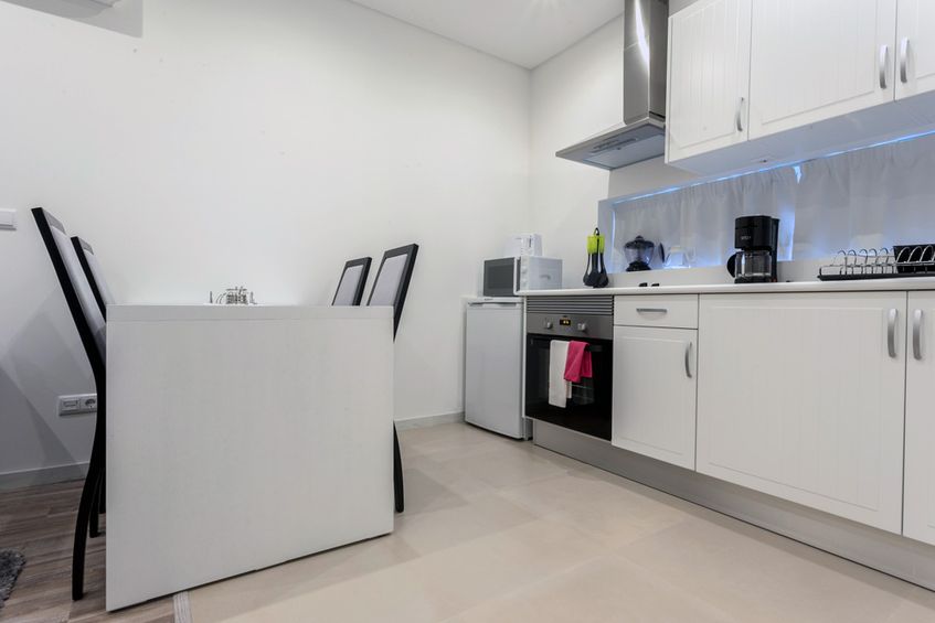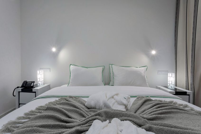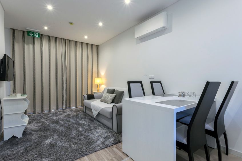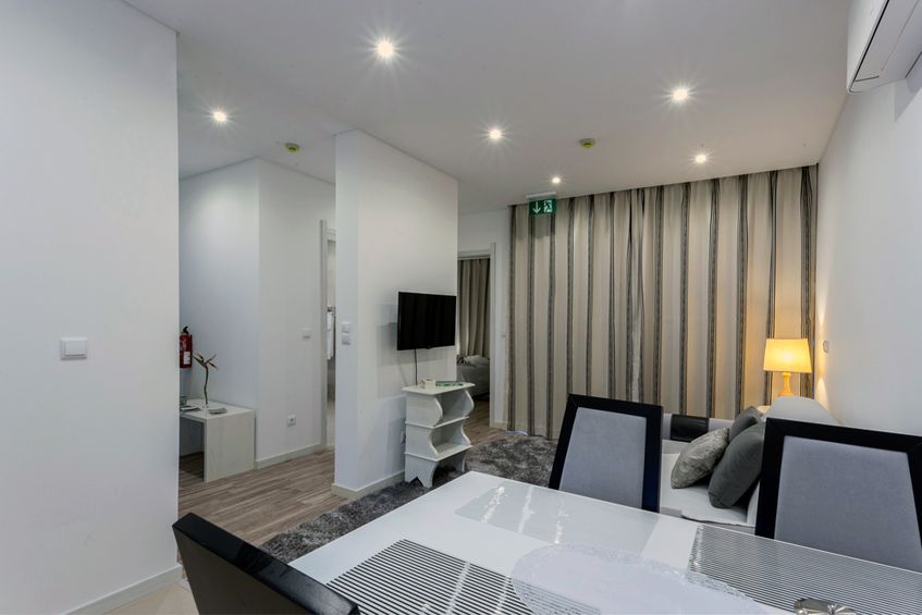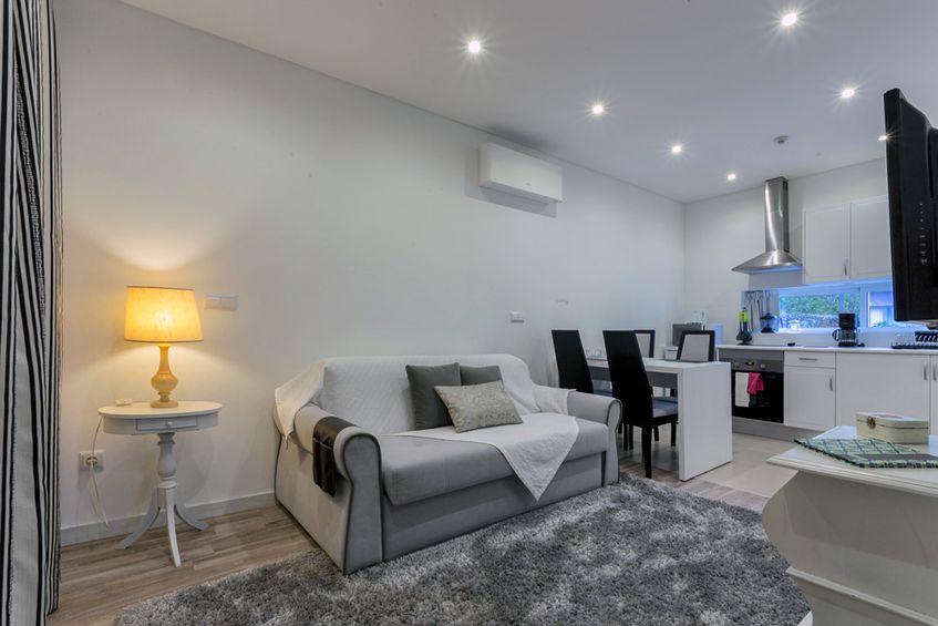 The 56m2 apartment has a view over the garden and mountains and is equipped with a kitchenette with everything you need to prepare a light meal in the greatest of comforts without many expenses. The living room has heating, dining table, LCD, sofa (can be used as extra bed) and exit to the terrace! The bathroom has a bathtub and some utensils and basic products. In the rooms you will find an LCD, a wardrobe, bedside tables, desk and even a personal safe. There is also Wi-Fi internet available throughout the apartment and outside space.