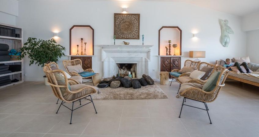 Our spacious living-room and atrium is the heart of our house. From here you can watch the magical sunsets over the horizon and enjoy a delicious meal made by our kitchen. Sip on a glass of wine, home made juice or cup of tea in our outdoor atrium garden or in front of the fireplace. Sandhi House is a base from where you can deepen your yoga practice, treat yourself to massages and selfcare, find peace in the beautiful surrounding nature or explore charming local small town life.