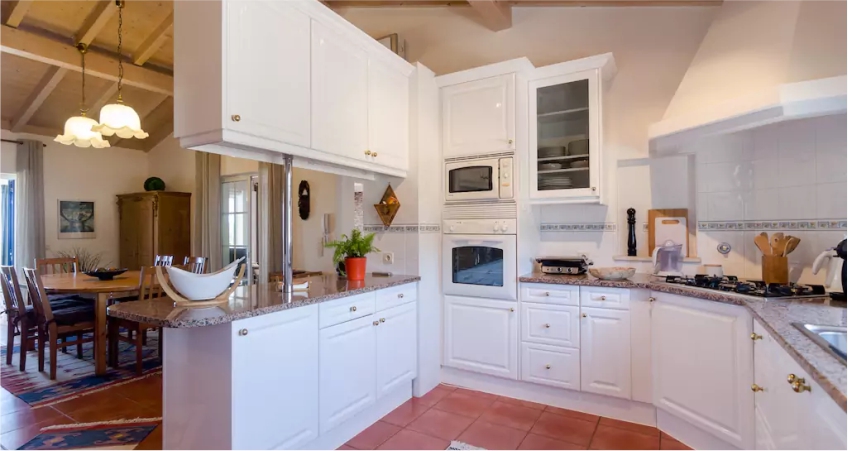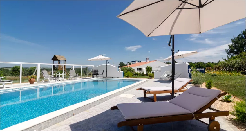 encanta com uma vista ampla à paisagem e pôr-do-sol sobre o mar, e faz sentir "em casa" com muito espaço (205m2), decoração individual, privacidade e conforto moderno, incluindo TV satélite, WiFi, aquecimento, cozinha completamente equipada e casa de banho dupla (banheira e duche). Bem adequada com crianças e para idosos, e animais de estimação são bem-vindos. Há 3 quartos, sala de jantar, sala com terraço privativo e jardim-de-inverno. O amplo espaço verde integra a piscina e BBQ.