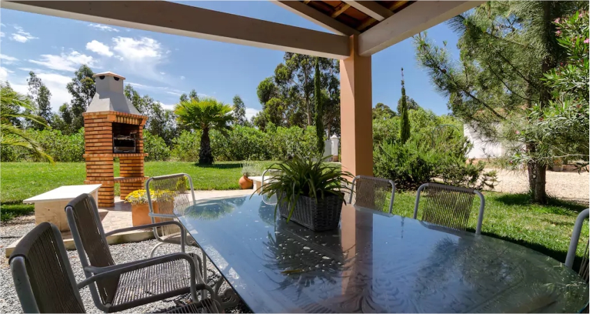 A zona de barbecue é perto da piscina, mas escondida da vista por árvores e arbustos. No alpendre ao lado da churrasqueira há mesas de jantar com lugares para 12 pessoas à vontade.