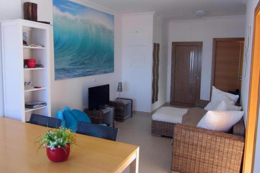 Acorde com uma vista deslumbrante para o mar! A sala de estar é aconchegantemente mobilada com uma área de assento e uma grande mesa de jantar. Da sala de estar você tem portas de pátio que o levam para a varanda na frente e lado do mar. O ar condicionado proporciona uma sensação fresco no verão ou de aquecimento no inverno.