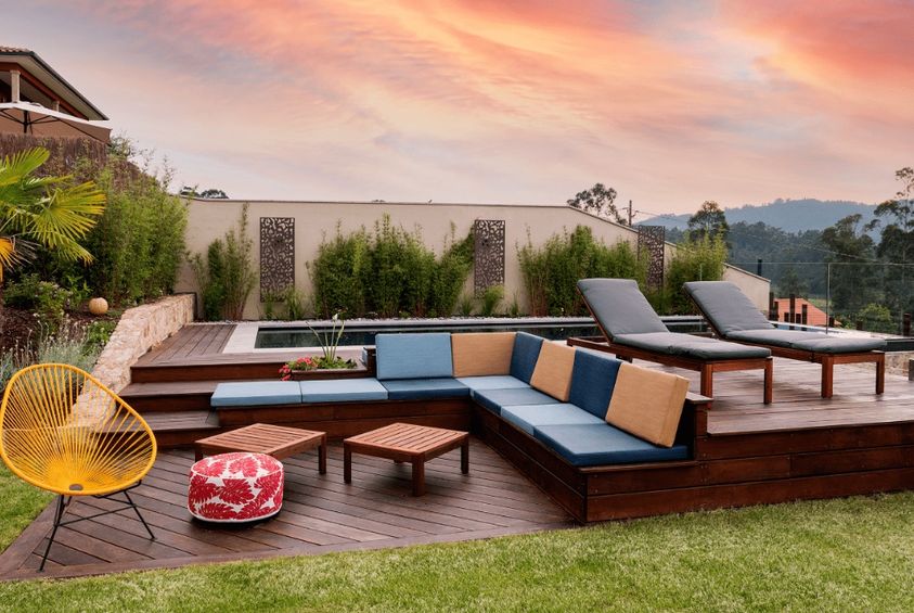 As grandes janelas salientes proporcionam luz natural e abrem-se para um espaço verde e acolhedor para revigoramento ao ar livre.