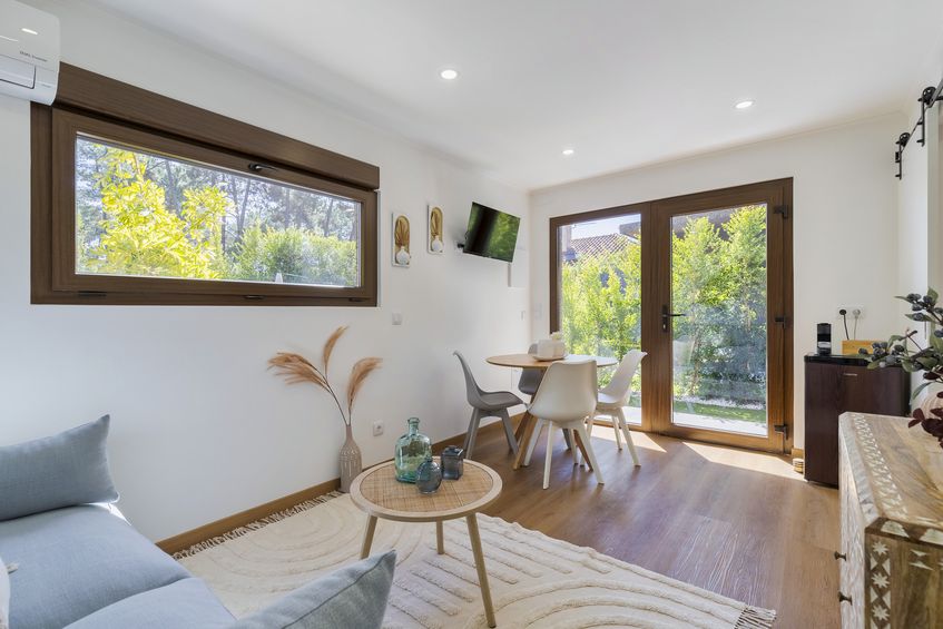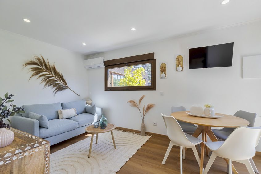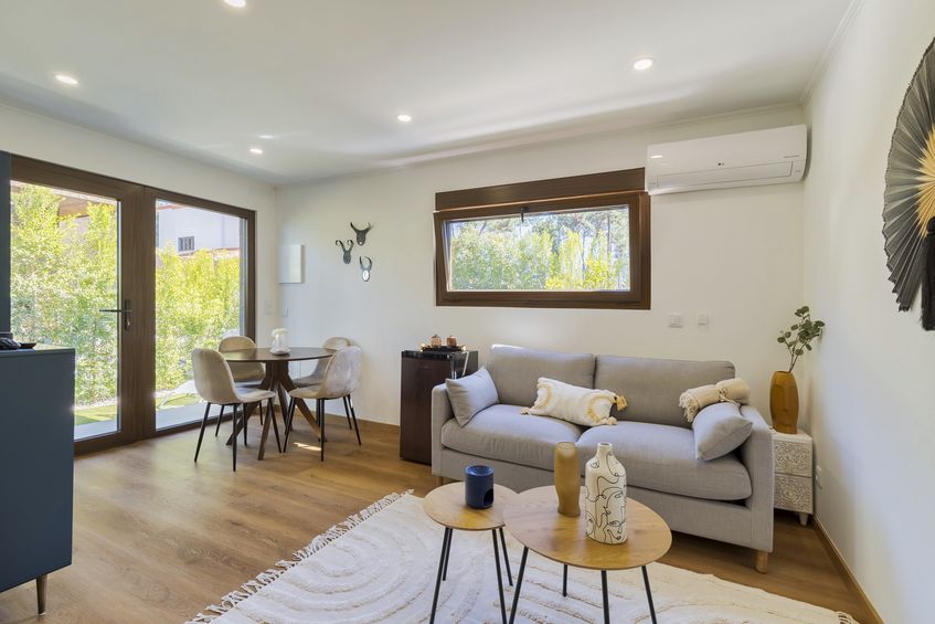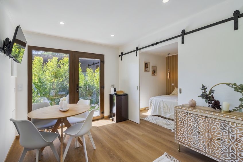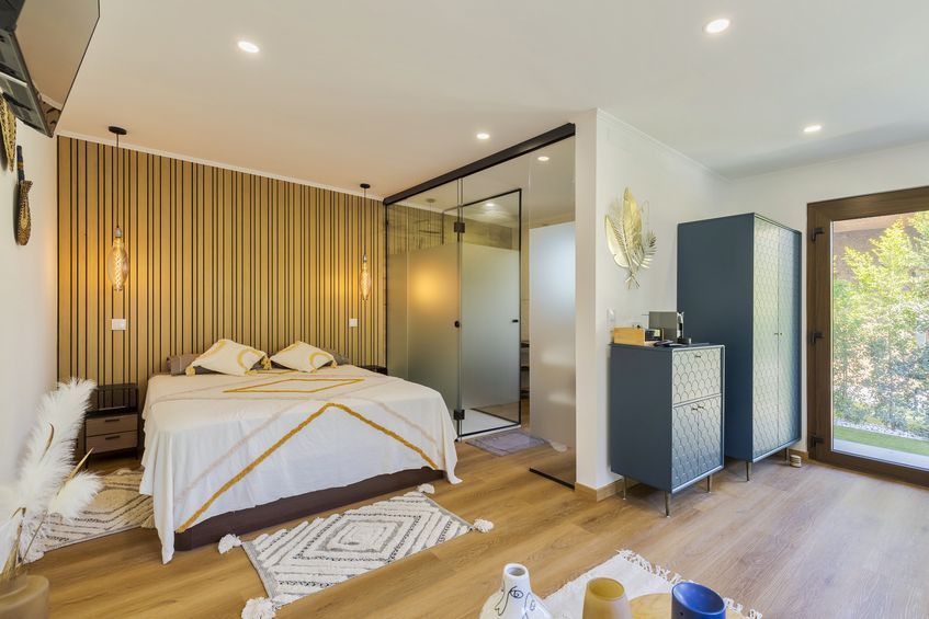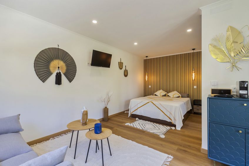 As nossas suites são compostas por uma suíte com cama de casal, uma sala de estar com sofá-cama, pequeno frigorífico e máquina de café. Além disso, oferecemos ar condicionado e Android TV com acesso à internet Wi-Fi.