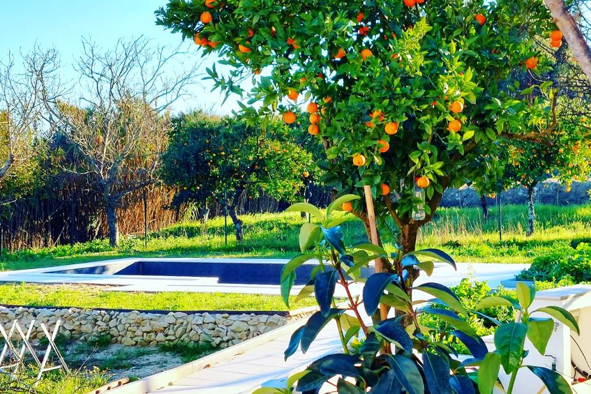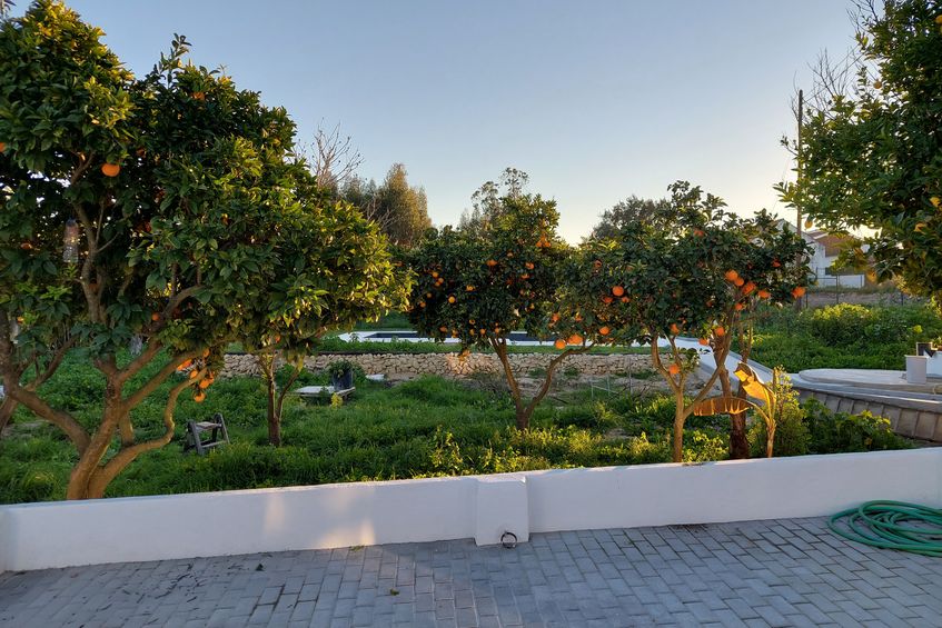 É um espaço com 1800m2 onde o espírito é manter o conforto no sossego do campo. Tem árvores de fruto e horta para consumo, assim como apostamos em culturas biológicas à medida do espaço, mirtilos, amoras, framboesas e morangos.