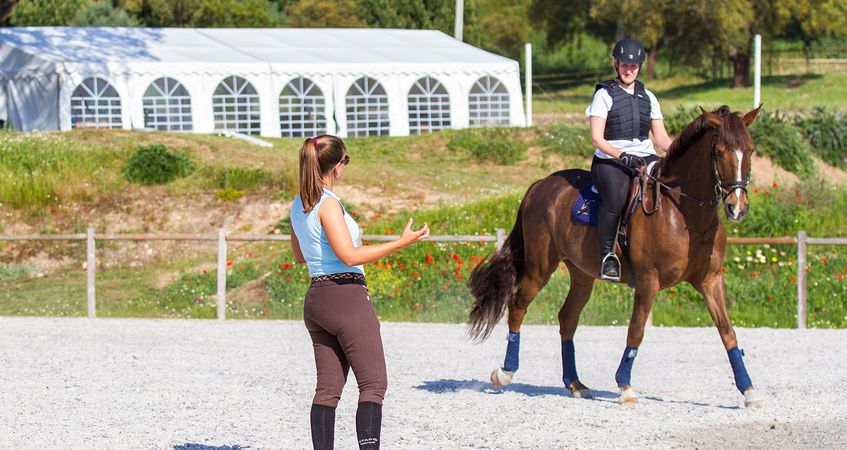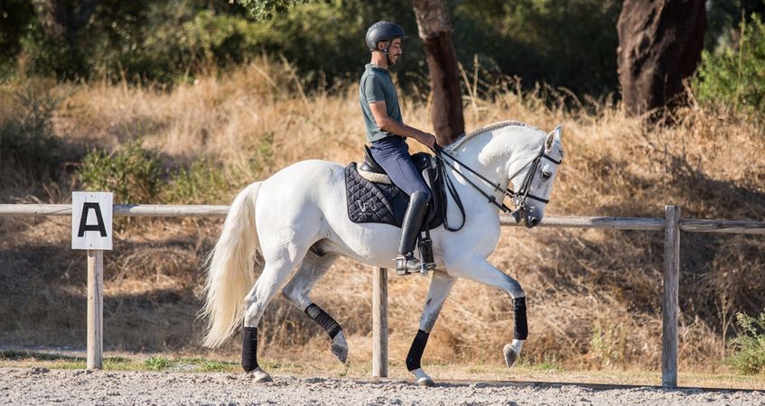 Dressage lessons are done mostly with Lusitano horses and some Warmbloods. In these lessons, we work lateral movements (yields to the leg, to the side, to the inside, among others), pirouettes to more advanced exercises such as piaffe and passage. The purpose of these classes is to improve specific exercises and introduce more advanced ones.
