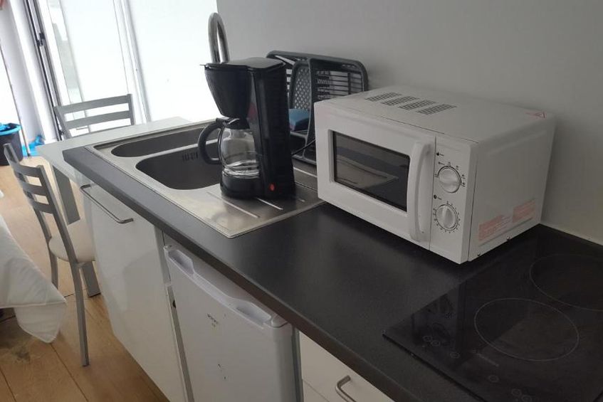 Cozinha: Móveis superiores e inferiores com lava-loiça, frigorífico, exaustor, forno micro ondas e termoacumulador