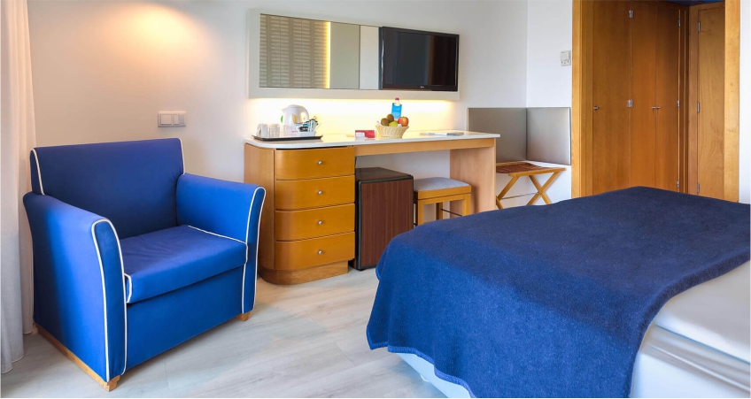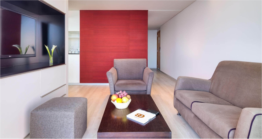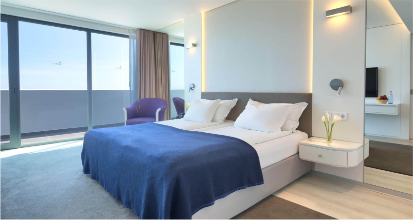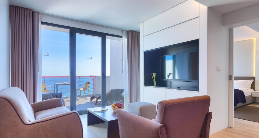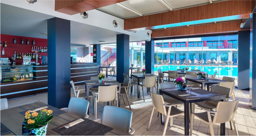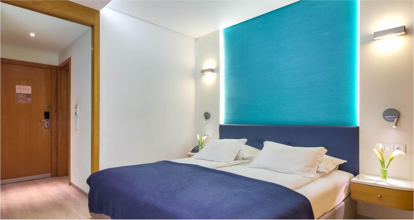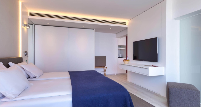 With a smart interior decoration, privileging an elegant architecture and strong colours, the hotel has 11 floors and offers 168 double rooms, 32 apartments and 62 studios, all featuring a balcony, sea and/or mountain view.