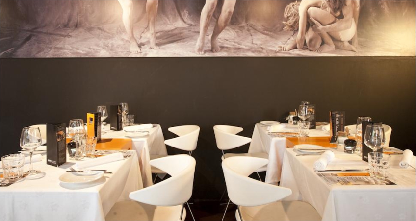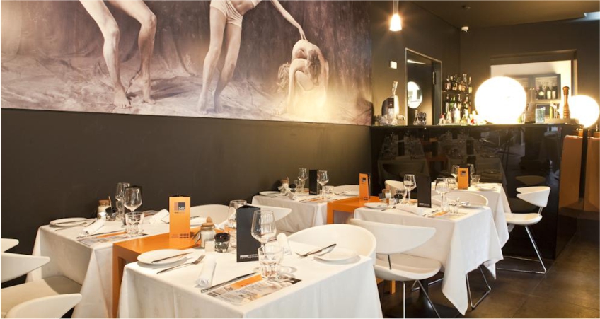 The hotel restaurant has doors in carved wood and there guests can enjoy breakfast and other meals in a modern setting with futuristic lamps and a huge picture on the wall.