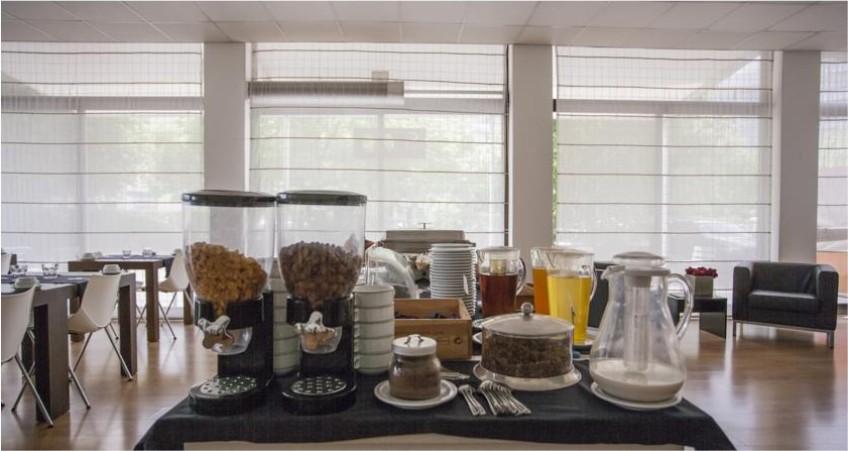O restaurante serve diariamente um buffet de pequeno-almoço acabado de fazer, na sala de jantar elegante com janelas do chão ao tecto. Os hóspedes podem desfrutar de uma bebida numa das mesas do terraço para banhos de sol ou no bar.