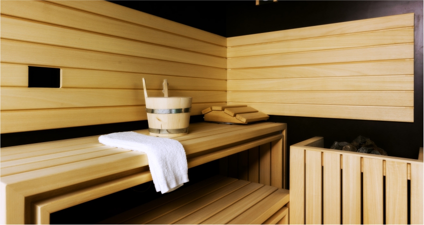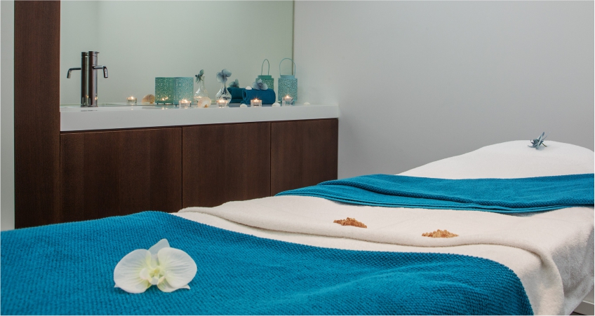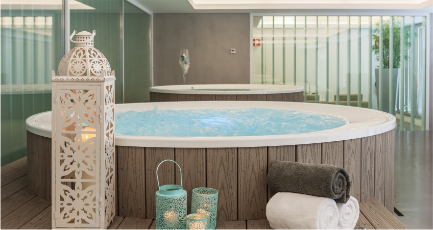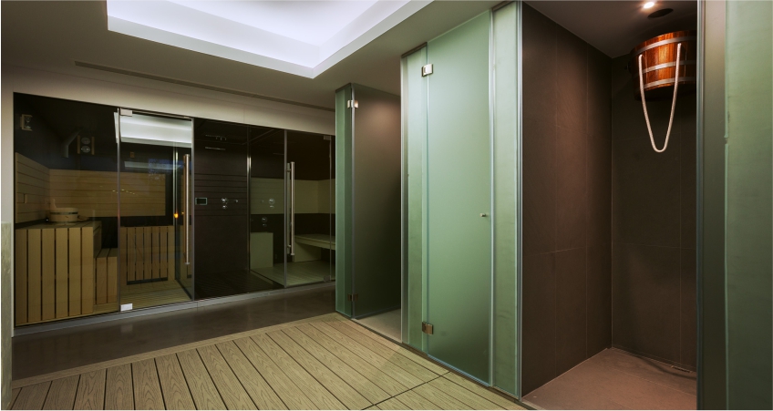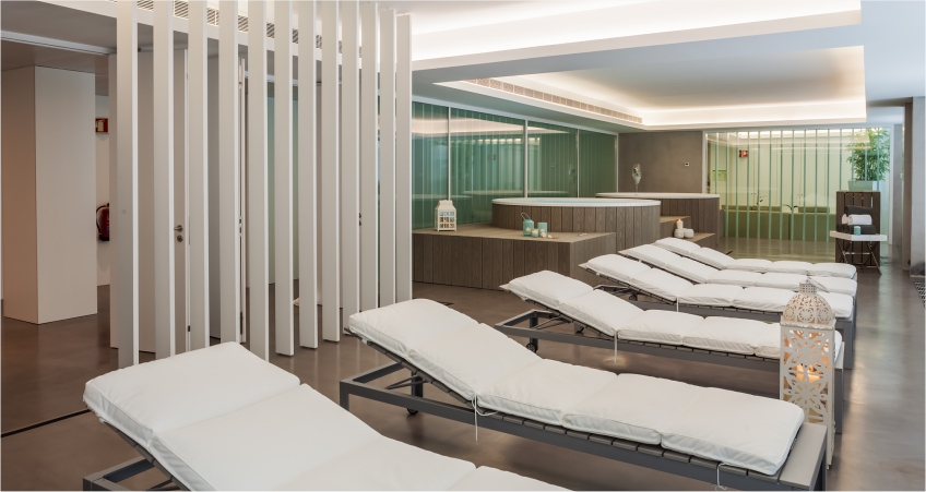 Um spa com 2 salas de tratamento, vestiários, dois jacuzzis, sauna, banho turco, duche sensorial, núcleo de duches de tratamento (duche bitérmico, duche de balde frio e cascata), fonte de gelo e ginásio.