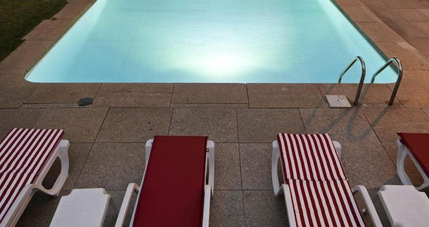 The nice pool area, garden and tennis court are also available to customers. Breakfast is included.