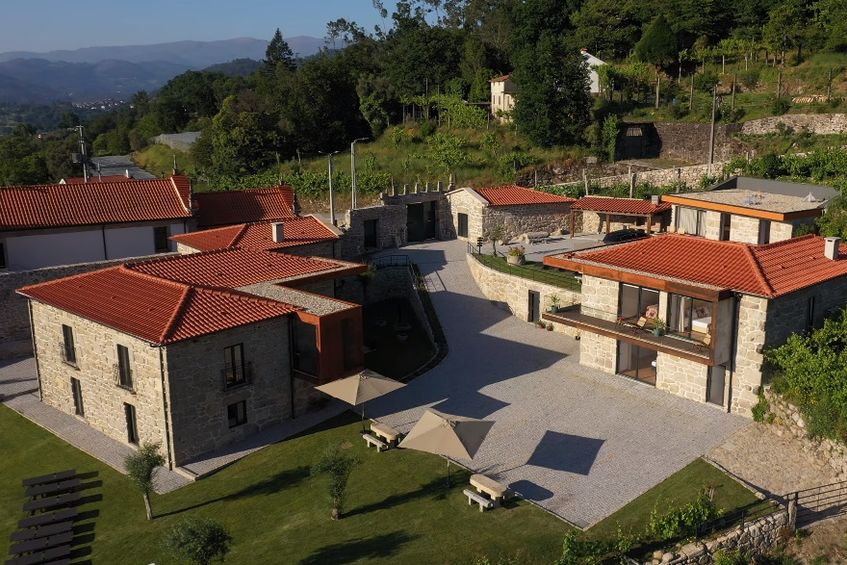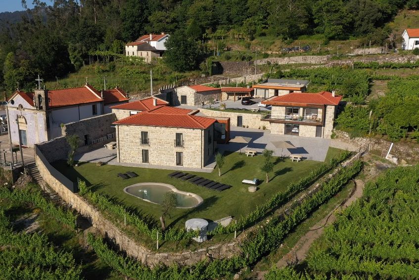 Located in the council of Ponte da Barca, Vale da Fonte is a harmonious fusion between the remodelling of a 19th century manor house and an exclusive contemporary design. The sobriety of the stone, the salt-treated sand pool that refers to the past in a simple tribute to the navigator Fernão de Magalhães contrasts with the soft green of the vineyards and the earthy colours of a decoration designed for the well-being of body and mind. Being the vineyards a great passion of the owner with about 6 hectares, the decoration was thought to detail by merging century-old furniture full of history with contemporary pieces full of glamour and comfort thought to details. The wine varieties served as inspiration, we privilege the tones of nature, wood and lush vegetation crossing with the beach environment of the sand pool combined with the comfort and sophistication of the materials.