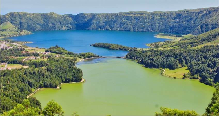 Saímos na direção ocidental, junto à costa, passando por Relva e Feteiras, sempre rodeados pelo verde e com o mar como pano de fundo. Começamos entretanto a subida para a emblemática Lagoa das Sete Cidades, alcançado o miradouro “Vista do Rei”. Daqui, onde podemos admirar toda a beleza da cratera gigante em cujo fundo coexistem as lagoas Verde e Azul, geminadas por uma ponte de arcos, que segundo reza a lenda tiveram origem nas lágrimas de uma princesa e de um pastor unidos por um amor impossível. Mas em São Miguel moram as grandes Lagoas dos Açores, e por isso o encanto prossegue logo ali ao lado nas Lagoas Santiago, Rasa, Canário, Éguas, Empadadas, Caldeirão grande e do Carvão.