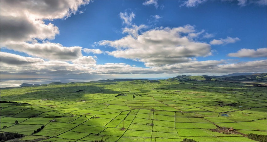 Mas é do alto das suas montanhas e serras, em miradouros estrategicamente posicionados, que melhor se pode absorver a imensidão dos seus vulcões e interiorizar o modo como o Homem os moldou. Sobe-se ao Monte Brasil, sem se perceber que se calcorreia um antigo vulcão com origem no mar – o maior e mais bem preservado dos Açores – para desfrutar de uma das vistas mais fabulosas sobre a cidade e a baía de Angra do Heroísmo. Do cimo da Serra do Cume percebe-se a geometria dos infindáveis muros de pedra e sebes de hortênsia que recortam as pastagens da Terceira. Do Miradouro do Facho, onde reside o imponente Monumento do Imaculado Coração de Maria, tem-se uma panorâmica excepcional sobre a praia, marina e casario da Praia da Vitória e de toda a planície das Lajes que, certamente, atraiu a implantação do Aeroporto. E a lista poderia continuar, longa.