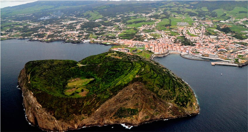 Vulcão extinto com 3 km2 rodeado pelos 4 km de muralhas da Fortaleza São João Baptista, a mais antiga fortaleza continuamente ocupada por tropas portuguesas, nos dias de hoje.