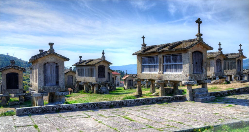 No declive do morro que o castelo de Lindoso coroa, encontra-se um conjunto de cerca de 60 espigueiros que datam do século XVIII e XIX, situado entre afloramentos de granito e grandes lajes que lhes servem de alicerces mas também de eiras. Neste local, o espigueiro é inteiramente de pedra com fendas verticais, estando o assento firme em pés singelos, com ou sem sapata, encimados por mós ou mesas de formatos variados, constituindo um dos aspectos mais sugestivos da paisagem rural da serra minhota.