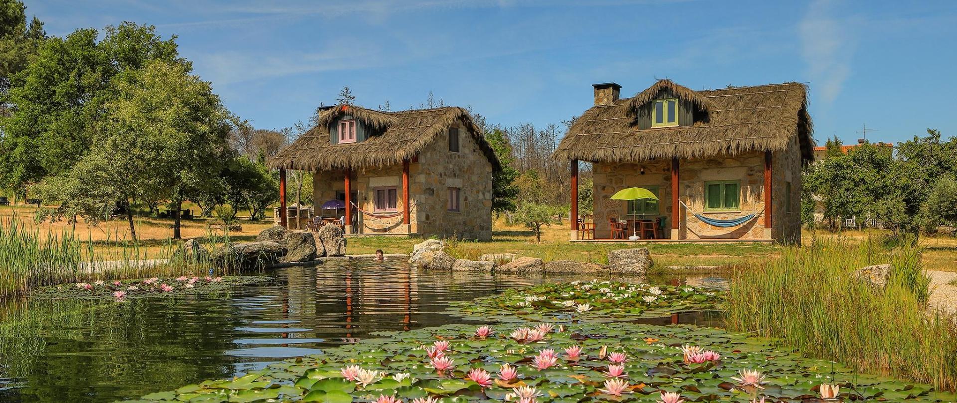 Uma quinta com oito hectares, árvores antigas, grandes maciços em granito, cogumelos e flores raras… onde, quando chega o pastor com o seu rebanho, o som dos badalos inunda o prado… mas é também… um pequeno aglomerado de confortáveis casas em pedra e telhados de colmo, que parece ter estado sempre ali, em volta da piscina biológica de águas cristalinas, que, nos dias de calor, desafiam a um mergulho… Apetece estar cá fora, apenas a observar a natureza, ou a saborear conversas