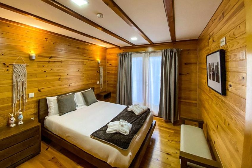 Composta por: Sala Comum com TV Cabo, Kitchenette equipada, 2 Quartos de casal, ambos com cama de casal, Mezanino com duas camas de solteiro, com vista para a sala comum, 1 Quarto de banho, Varanda, Churrasqueira e Piscina exterior privada.