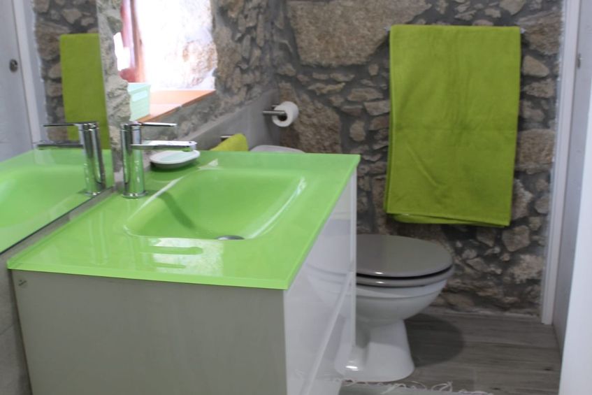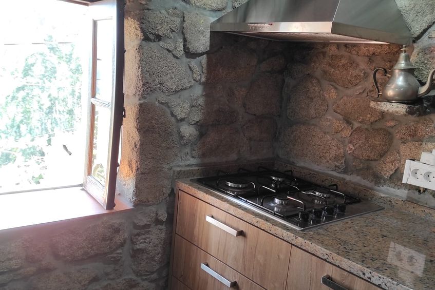 Uma casa de banho completa (com poliva), uma cozinha toda equipada, uma lareira a moda antiga.