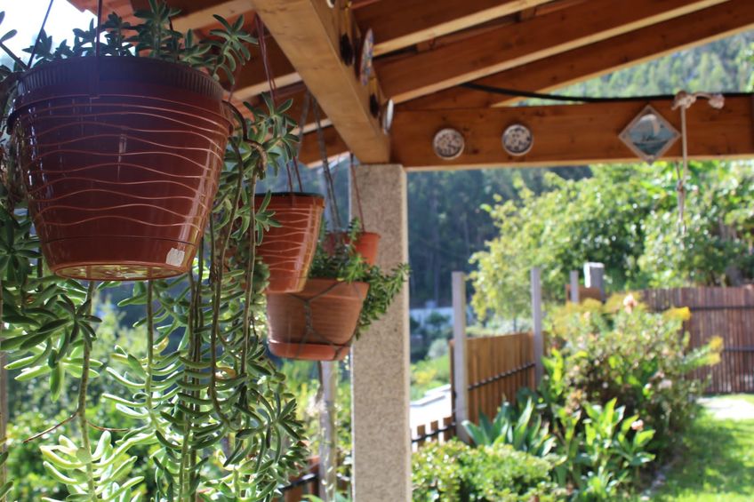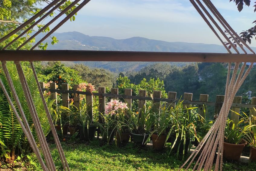 Espaço exterior com um pequeno jardim para desfrutar da paisagem para a serra, incluindo uma churrasqueira.