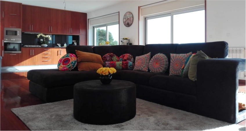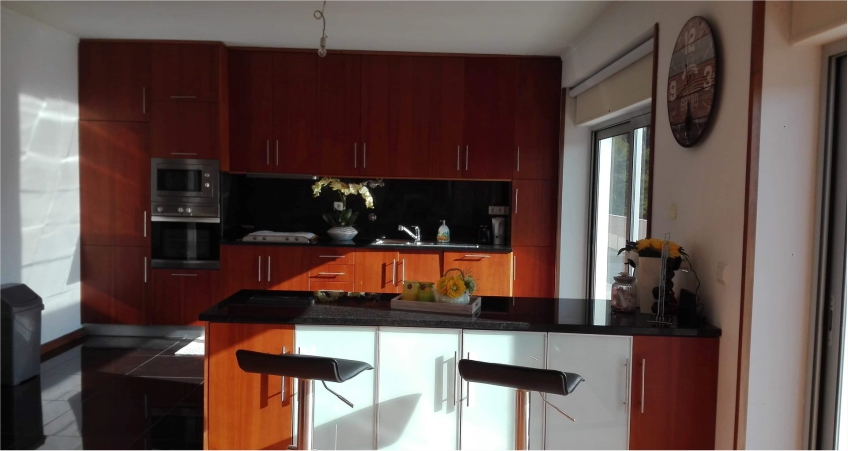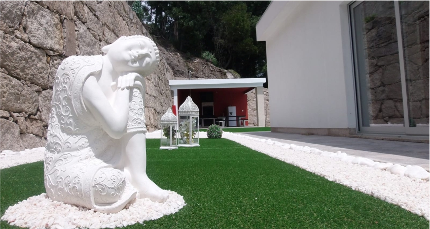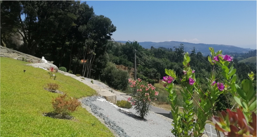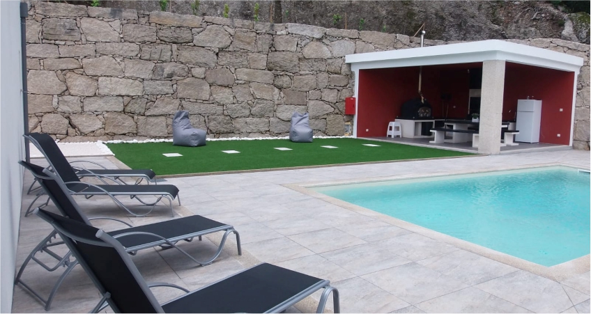 Tem zonas de lazer com piscina com água aquecida, churrasqueira, jardim e salão de jogos.