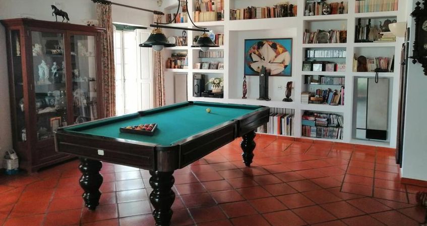A casa dispõe de churrasqueira, matraquilhos, mesa de snooker, jogo de xadrez, damas e baralhos de cartas.