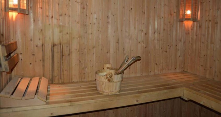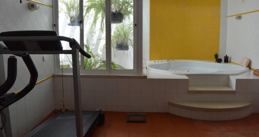 Amplo solário reservado. Ginásio com sauna, hidromassagem, e aparelhos de ginástica.