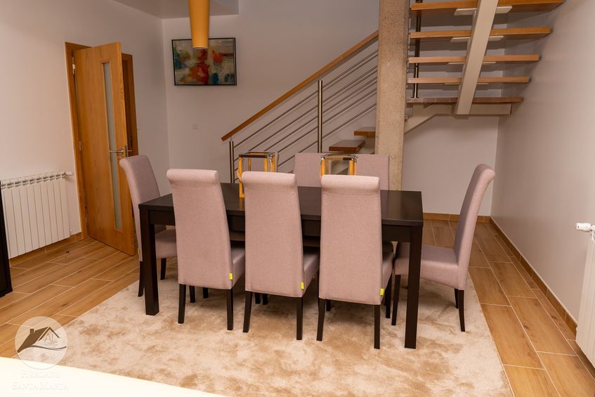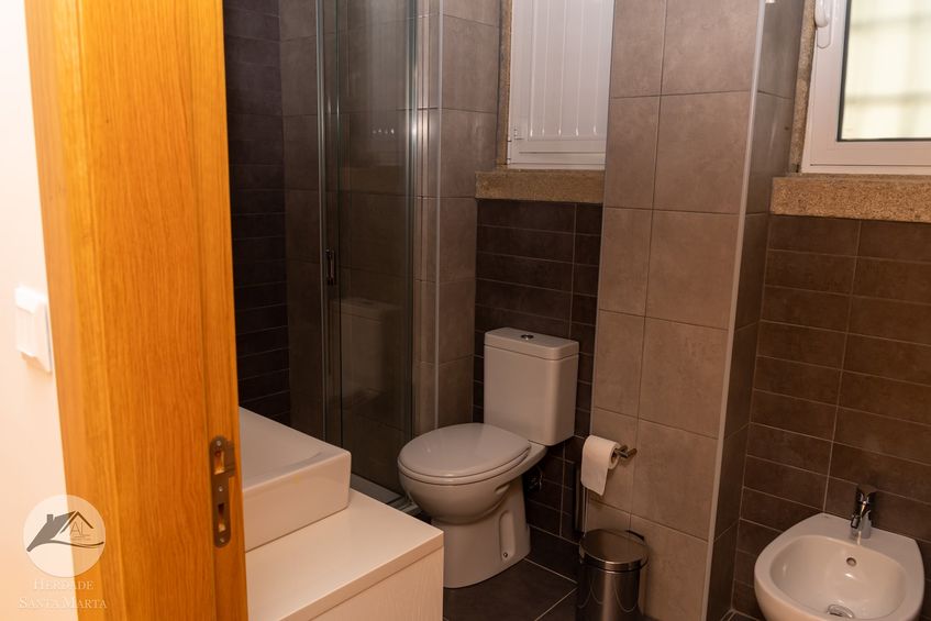 Casa de rés do chão e primeiro andar, escadaria em granito com telheiro, indicado para uma bebida matinal ou no fim de tarde, sempre com a paisagem das terras de Espanha à vista. Com hall de entrada, uma sala de estar e jantar, lavandaria/dispensa, um quarto de casal com w.c. e cozinha ampla com área de refeições e completamente equipada.