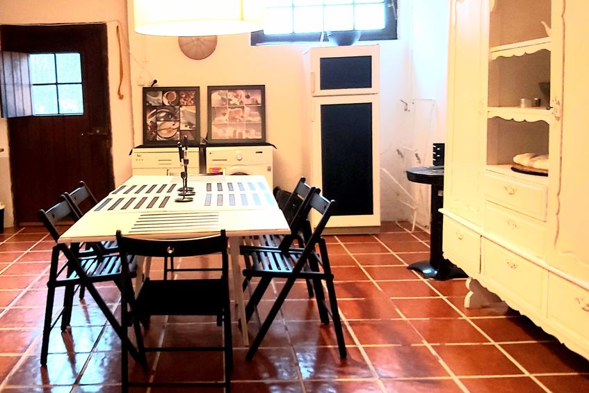 Descrição: quarto principal, quarto interior e mezanine, sala c/ salamandra na lareira, cozinha c/ casa jantar, chão de tijoleira
