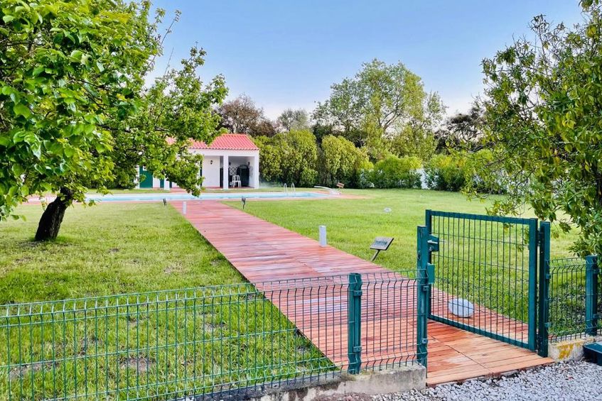 Piscina c/ telheiro (casa banho, casa bomba e casa arrumos), cercada c/ cerca metálica e portão.