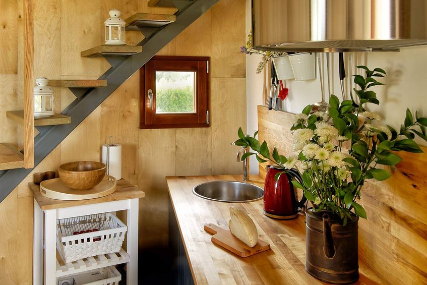 A casa possui um quarto no mezanino e uma sala com kitchenette e um wc no piso inferior.