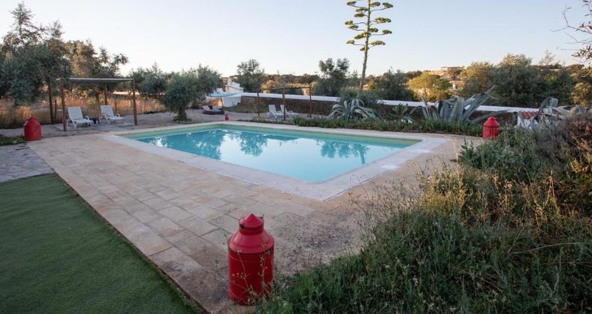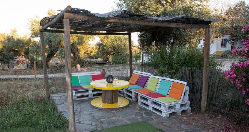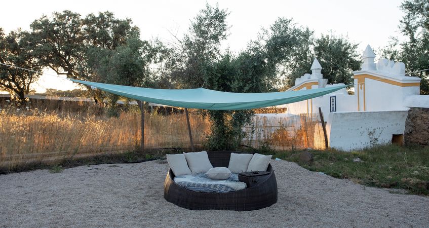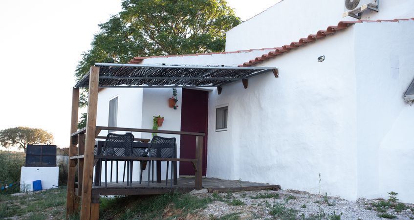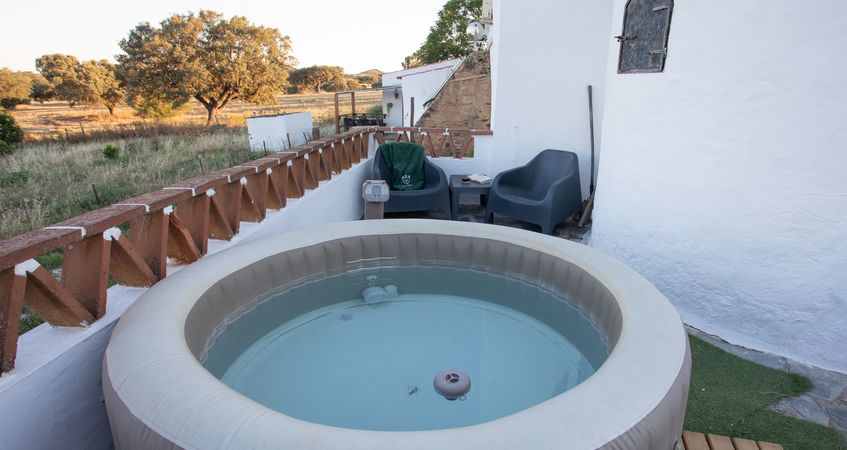 No exterior foram criados vários pátios e zonas de lazer, quer seja o pátio da piscina, o pátio do forno onde está localizado o jacuzzi ou mesmo o pátio da Fonte dos Amores. Queremos que tenha sempre o seu espaço e poder sentir-se totalmente relaxado ouvindo apenas os sons da natureza e do Monte e apreciar a vista sobre o Olival, o Montado de Azinho e o Medronhal.
