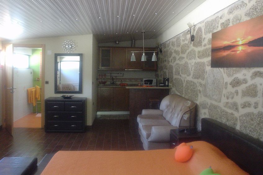 Apartamento/Estúdio localizado no rés-do-chão, com kitchnette, cama de casal, sofá cama com duas camas individuais, uma casa de banho e um WC.