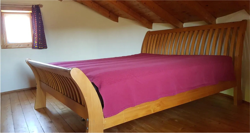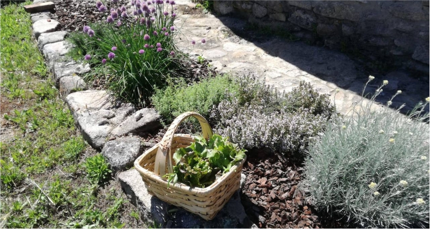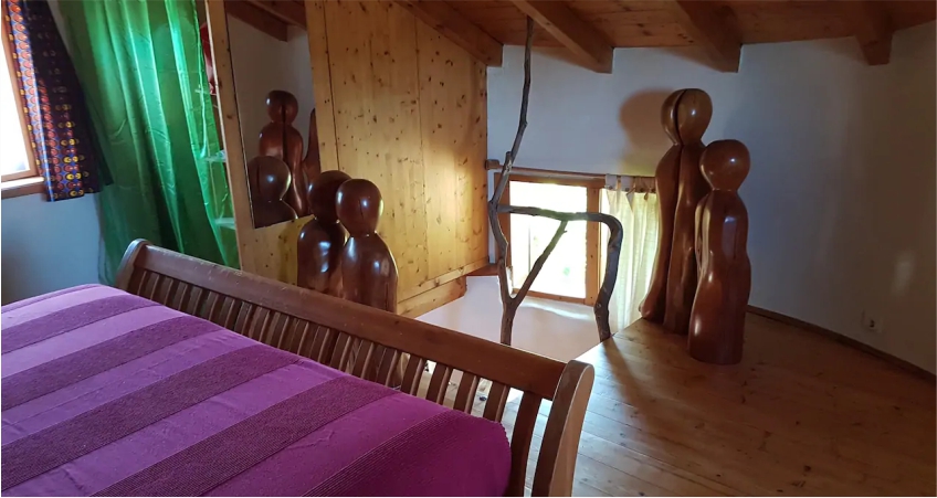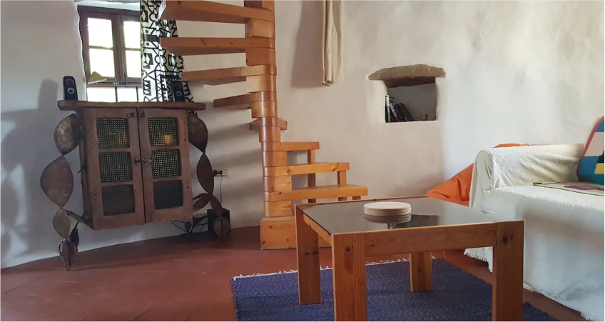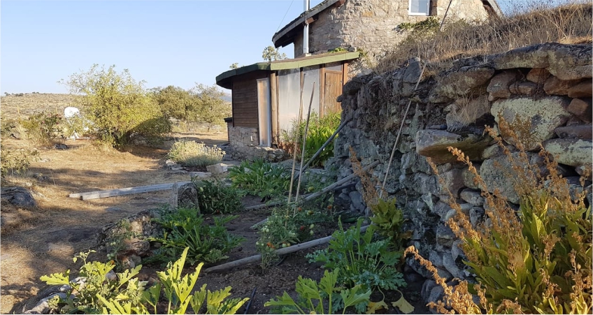 The sheltered space consists of two levels (perfect for couples): the ground floor offers a fully equipped kitchen, dining/sitting room and toilet/shower room. The higher level is a bedroom with king sized bed. Heating is supplied by wood burning stove and water is solar heated. The house has well water, 4G internet and good mobile signal. The outside area has oak/citrus trees, a seasonal herb and vegetable garden, ornamental garden and a bamboo grove shower. Ample place for leisure.